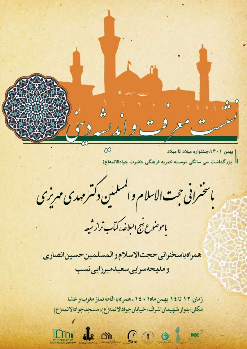 ضمن تبریک ایام میلاد با سعادت امام جواد(ع) و مولای متقیان علی (ع)، با افتخار از شما دعوت می شود تا با حضور در نشست معرفت و اندیشه دینی که با سخنرانی حجت‌الاسلام و المسلمین دکتر مهریزی با موضوع نهج‌البلاغه، کتاب تراز شیعه برگزار می شود، بر غنا و عمق این نشست بیافزایید. این برنامه با سخنرانی حجت‌الاسلام والمسلمین حسین انصاری و مدیحه سرایی سعید میرزایی نسب در سه شب متوالی برگزار می گردد.